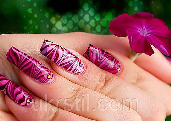 Водний манікюр має досить оригінальний дизайн, який створюється за допомогою розлучень, вигадливих ліній і незвичайних орнаментів. Для того, щоб створити такий незвичайний і в той же час актуальний манікюр вам знадобитися ємність з водою і кілька крапель лаку.